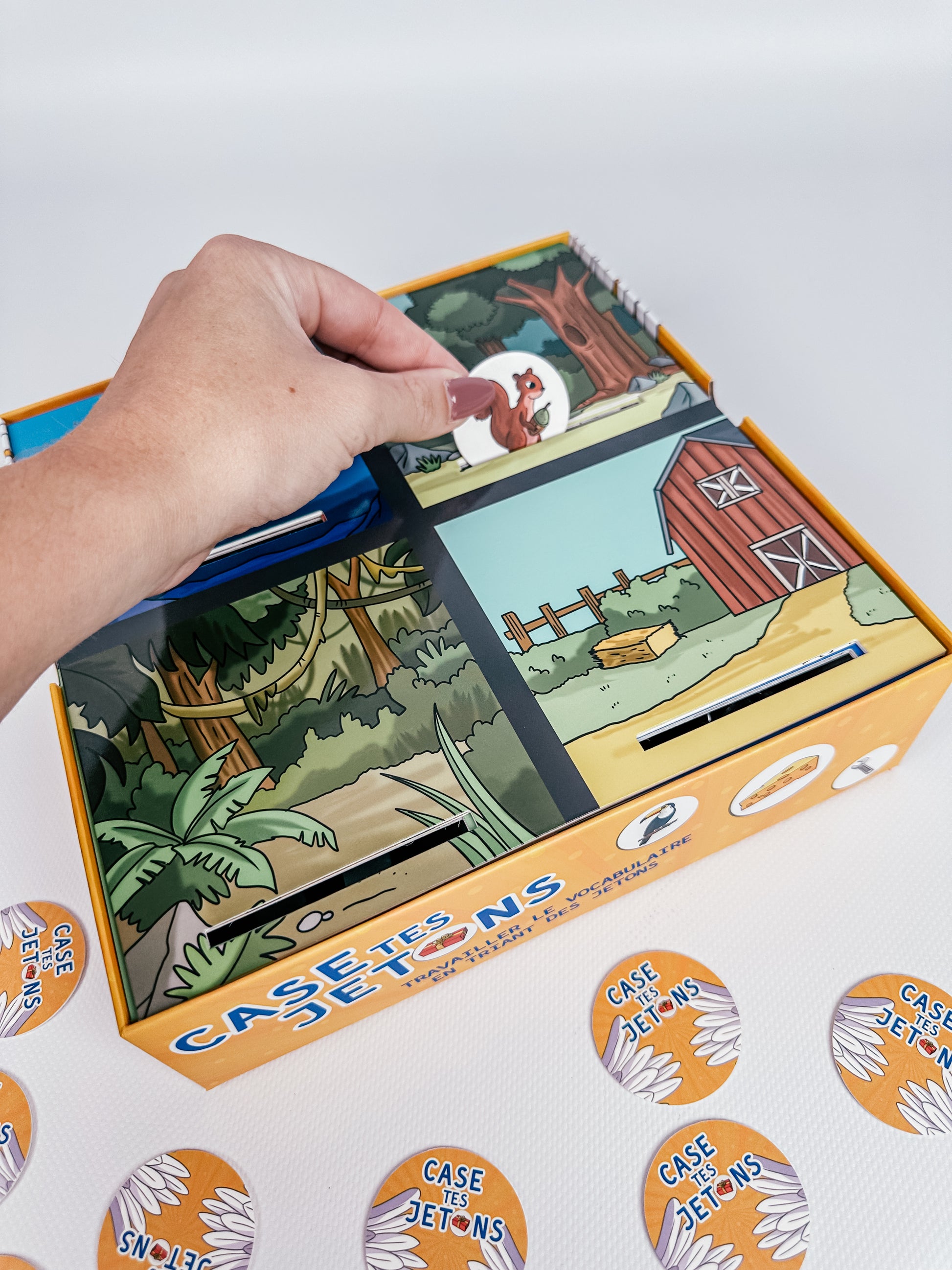 Principe : on choisit un plateau → on trie les jetons dans les bons compartiments → on valide et on recommence !