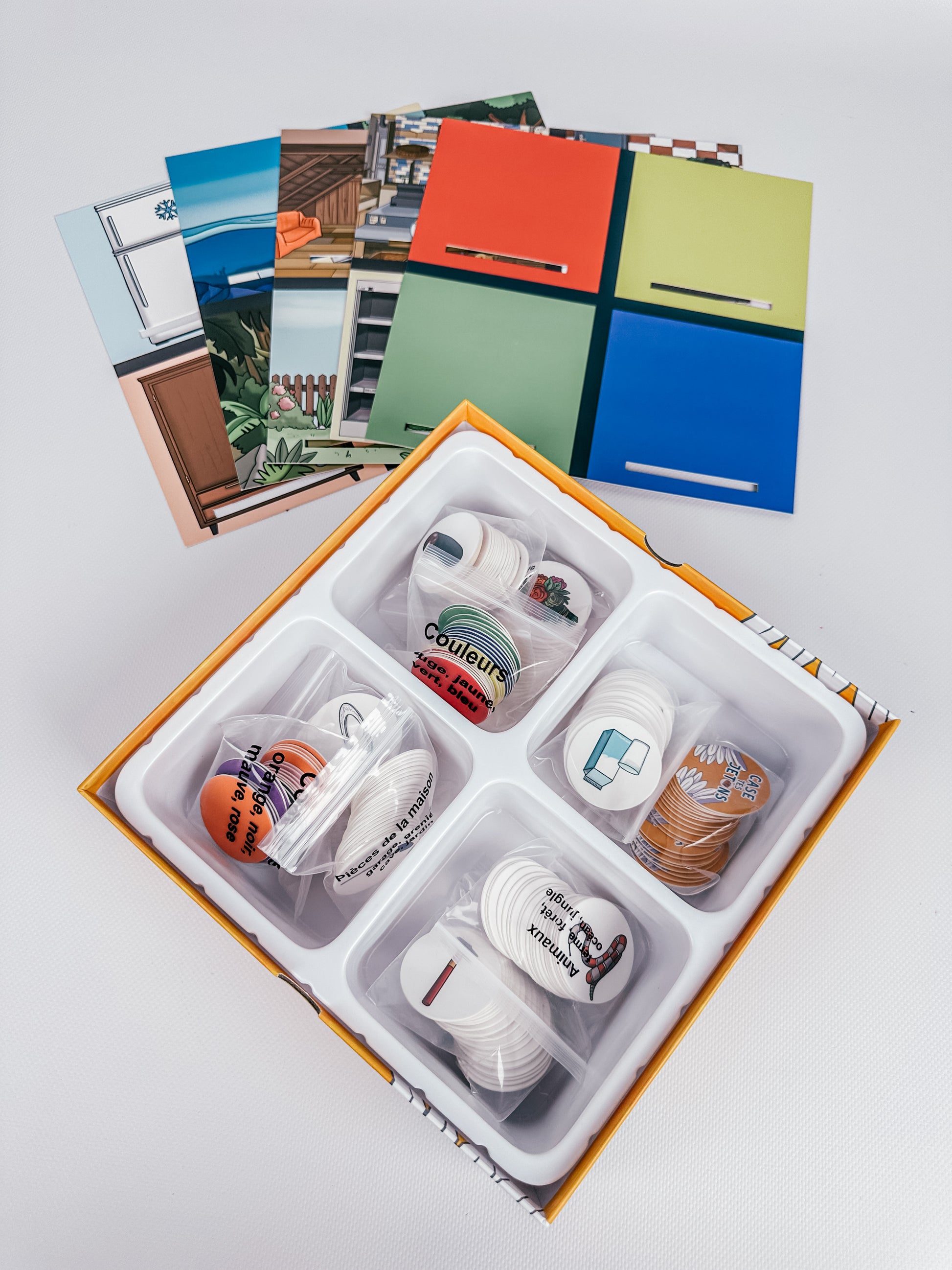 Les plateaux abordent des thèmes du quotidien : animaux, vêtements, objets, nourriture, couleurs, etc.