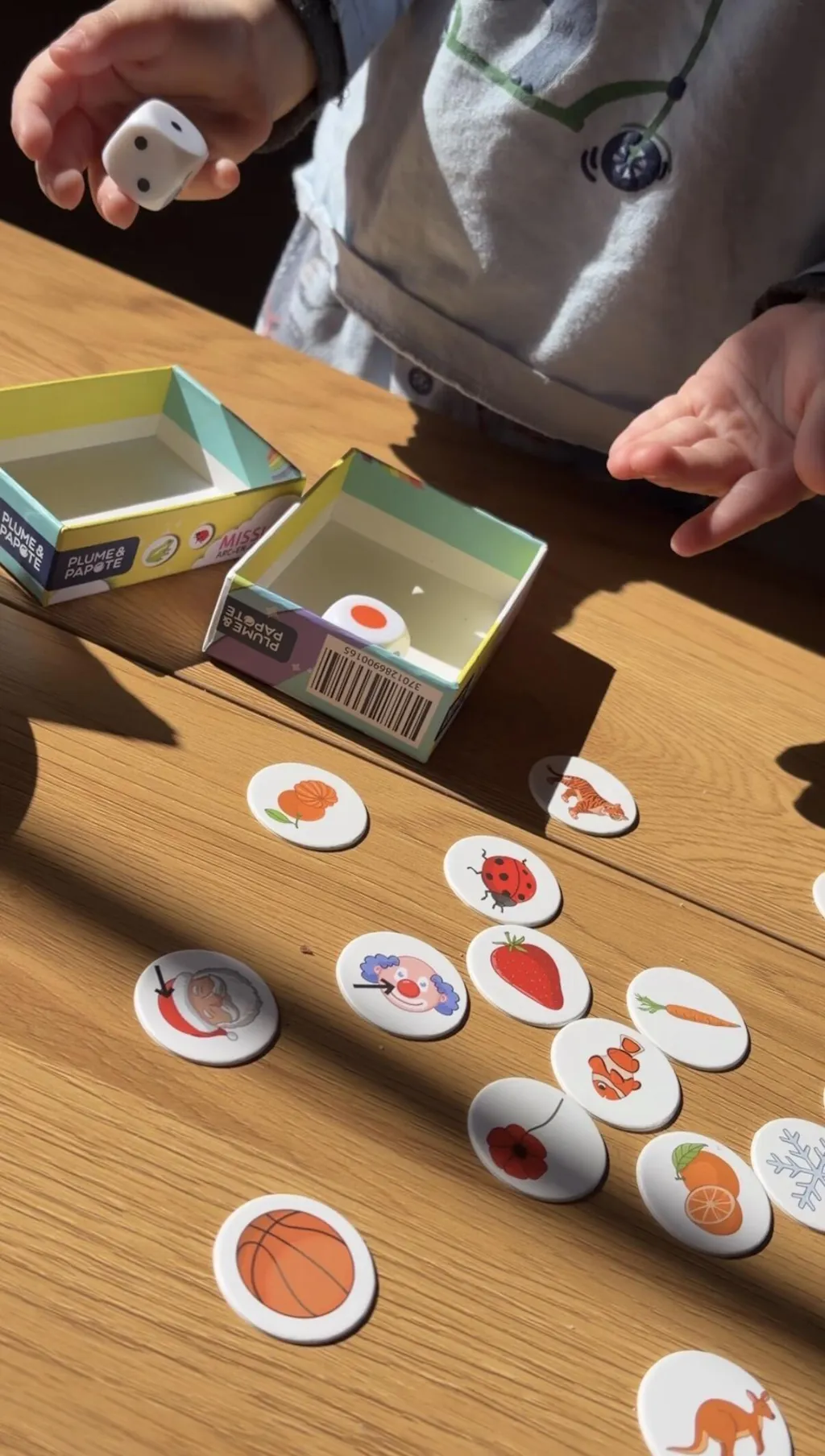 Grâce aux dés, ils doivent repérer le plus vite possible les bons jetons : 3 objets rouges ? Vite! Une fraise, un camion de pompier, un coquelicot !